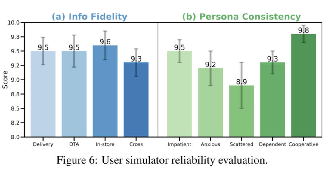 用户模拟器:在信息保真度(9.48/10)与人格一致性(9.34/10)两项指标上均表现优异,能准确模拟不同用户行为和偏好,且不违背任务要求。