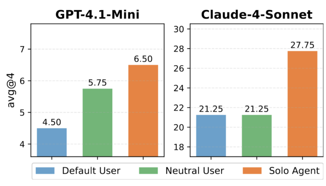 交互复杂性:在「直接告诉Agent完整指令(无用户交互)」条件下,模型成功率显著提升;而引入真实用户模拟器(包含完整人物特征和行为属性)后,性能下降15–25个百分点,尤其对弱模型影响更大。