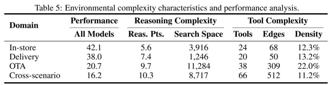 推理复杂性:任务所需推理点数量与成功率呈强负相关。在线旅行与跨场景任务平均包含9.7–10.3个推理点,搜索空间相比其他两个领域高出一个量级,成功率也更低。