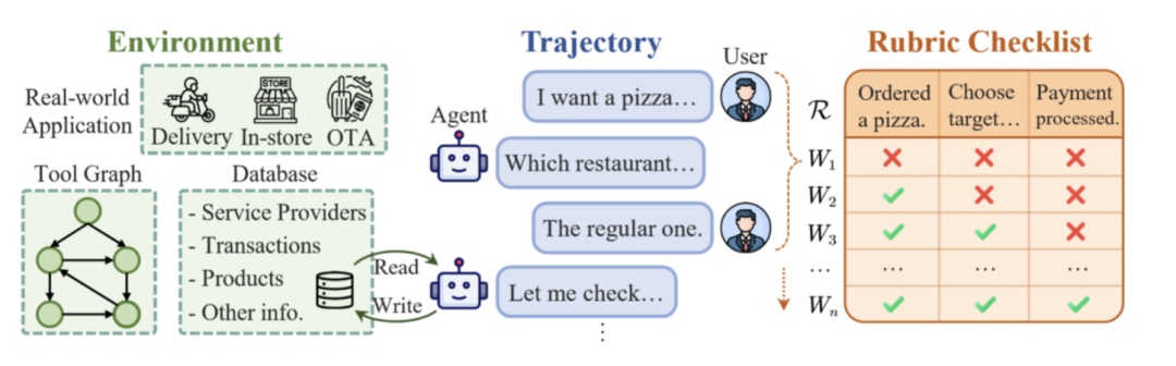 传统的基于数据库状态比对的评估方法难以捕捉商品推荐、行程规划等不改变最终状态的行为,无法对Agent完成任务的过程进行有效监督。VitaBench借鉴最新研究,将任务目标拆解为一组原子化评估准则(Rubric),实现了更全面、细粒度的行为覆盖。