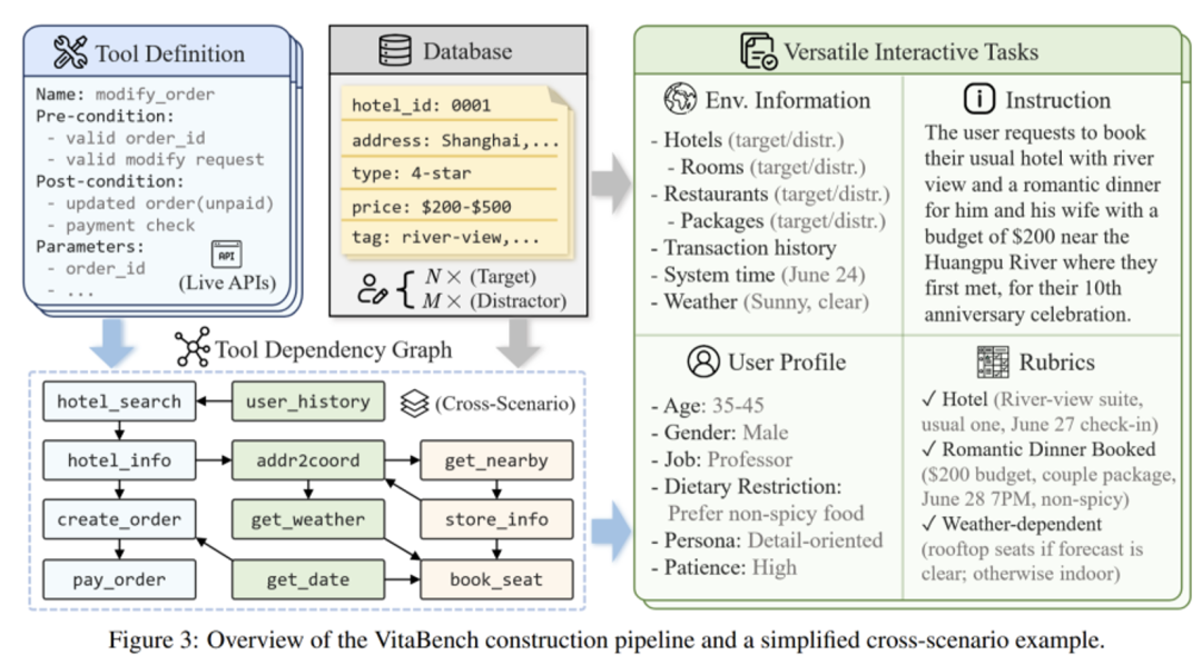 VitaBench以外卖点餐、餐厅就餐、旅游出行三大高频生活场景为典型载体,构建了一个包含66个工具的交互式评测环境,并设计了跨场景综合任务。