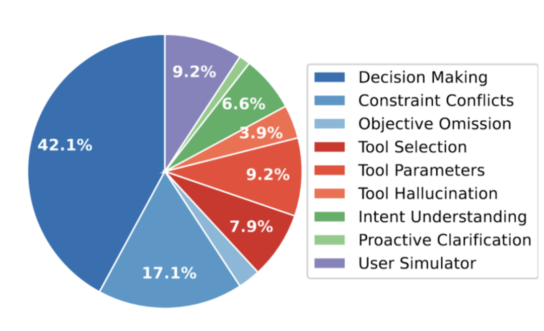 在对模型错误案例的系统分析中,团队归纳出代表性三大错误类别:推理相关错误(61.8%)、工具相关错误(21.1%)、交互相关错误(7.9%)。