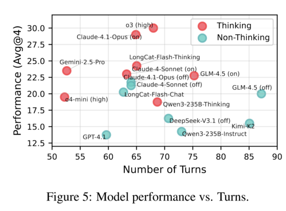 “思考型”模型显著优于“非思考型”:启用链式推理(thinking)的模型普遍提升5–8个百分点,且交互轮次更少,说明深度规划对复杂任务至关重要。