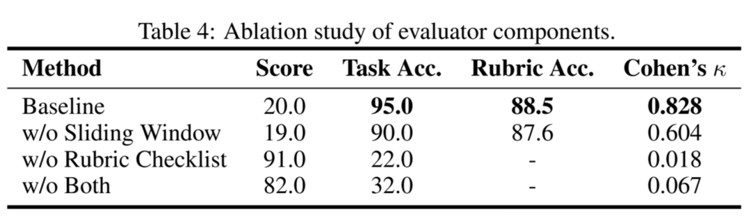 滑动窗口评估器:与人工标注相比,Cohen’s κ达0.828,显著优于无Rubric或无滑动窗口的基线方法。