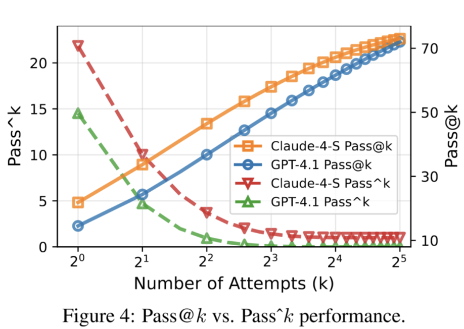 多次尝试(探索)可以提升性能,但同样稳定性堪忧:尽管Pass@4(至少一次成功)可达60%,但Pass^4(四次全成功)接近0%,说明模型行为高度不稳定,难以满足生产环境可靠性要求。