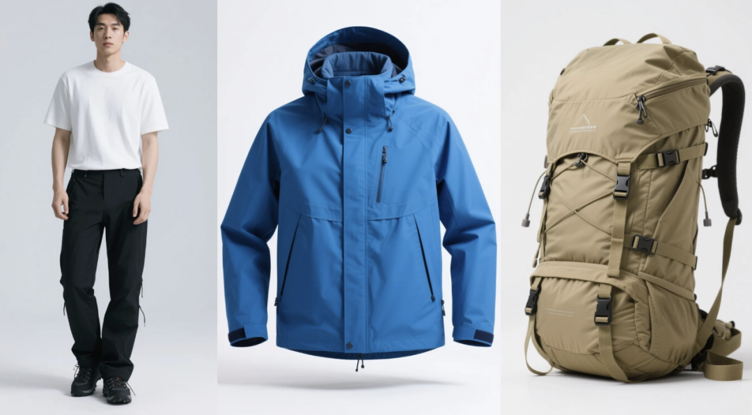 一个典型的应用场景便是电商行业。例如,商家只需提供几张静态的产品图片,如模特的服装、冲锋衣和登山包: