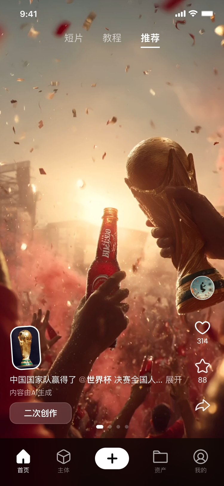 在Vidu AI APP,只需轻松点击“二次创作”,@一下主体就可以生成一段玩好有趣的合拍视频,你可以与你喜欢的角色进行合拍,或者基于其他人创作的AI视频更改其故事走向,任何脑洞大开的创意都可以在这里实现。不再需要繁琐的提示词,@主体+一句话就能生成有趣的视频,创作门槛大幅降低。