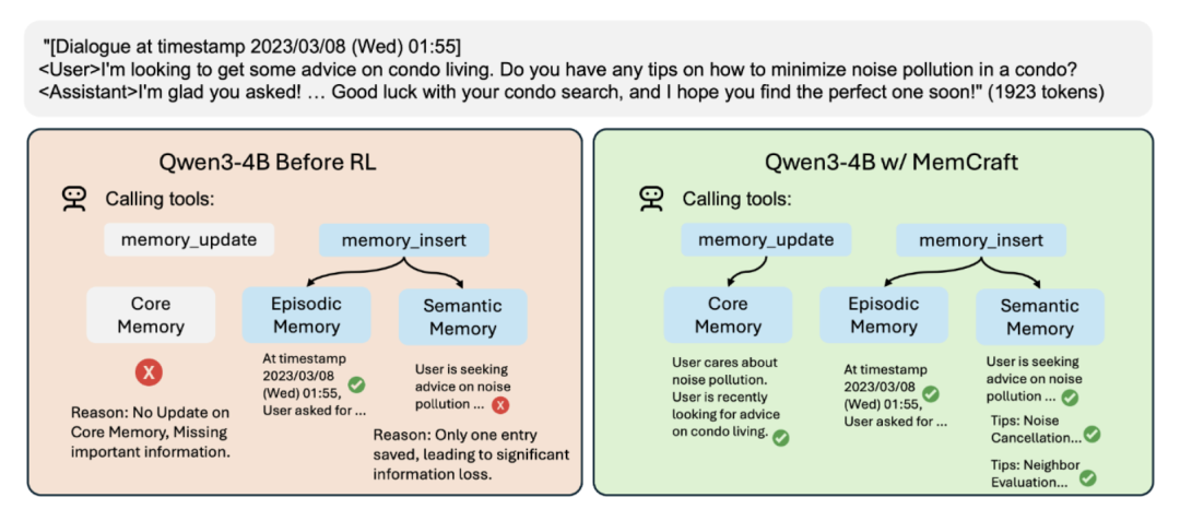 如上图所示,在没有强化学习的情况下,模型在管理记忆系统时会出现明显的错误:核心记忆没有更新导致重要信息丢失,语义记忆中只保存了单一条目造成信息损失。