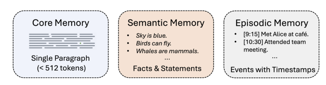 核心记忆(Core Memory):存储用户的基本、持久信息(角色、偏好、目标),容量512tokens; 情景记忆(Episodic Memory):记录带时间戳的事件,如 “[9:15]在咖啡馆遇见Alice”; 语义记忆(Semantic Memory):存储结构化知识和事实,如专业知识、操作指南等。