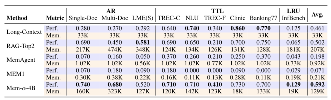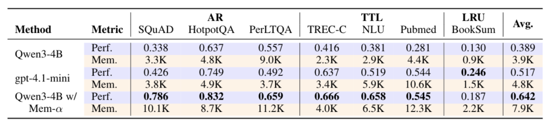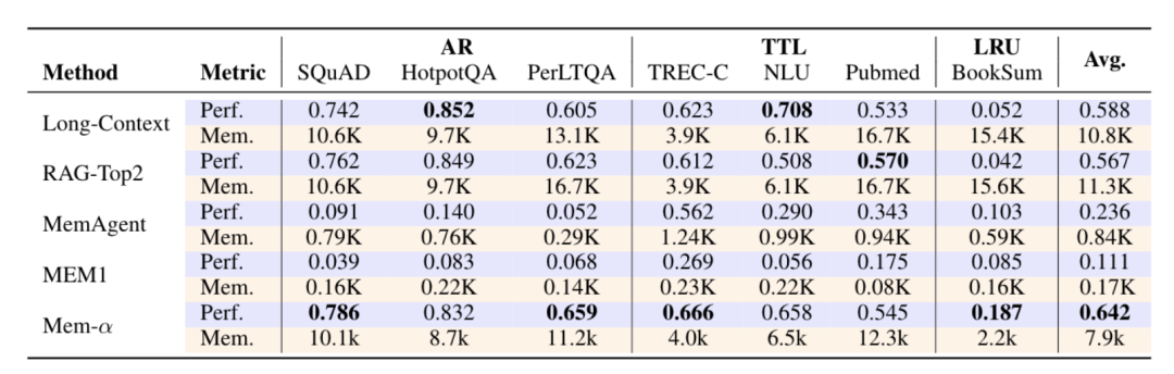 与以往依赖监督学习或手工规则的方法不同,Mem-α让智能体在处理信息流的过程中自主探索最优的记忆管理策略,并通过下游任务表现直接获得反馈。这种端到端的优化方式使得模型能够学习到真正有效的记忆构建策略。