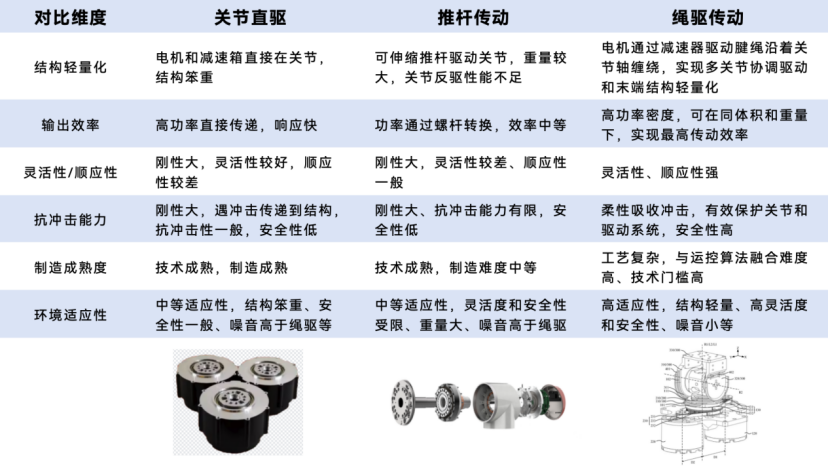 实际应用中,推杆与直驱传动虽然刚性大、输出稳定,但在灵活性和顺应性方面受到限制;而在同样单位重量和体积下,腱绳传动比直驱或推杆传动具备更高传动性能(即输出效率和灵活性),还能通过后置电机减少末端组件的体积,持续推动结构轻量化。随着机器人行业对灵巧性、安全性、柔性与轻量方面要求不断提升,绳驱传动方案已成为机器人发展重要方向。