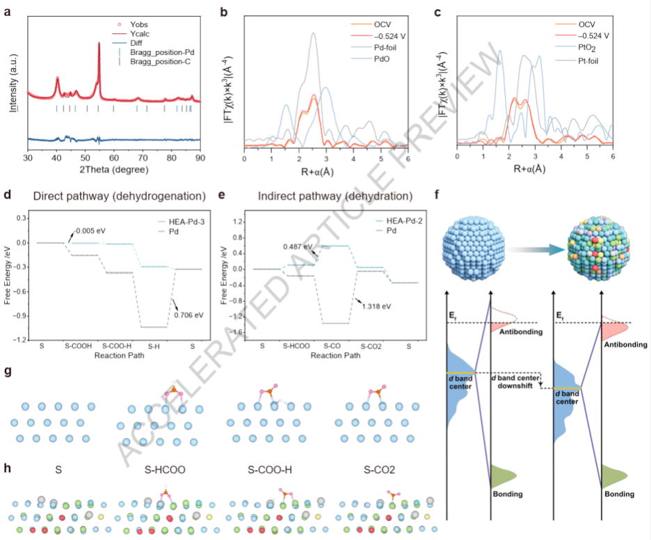 投影态密度(PDOS)分析进一步显示,高熵合金中钯的d带中心相对于纯钯明显下移,从而减弱了氢和一氧化碳的吸附强度,促进了脱附过程。