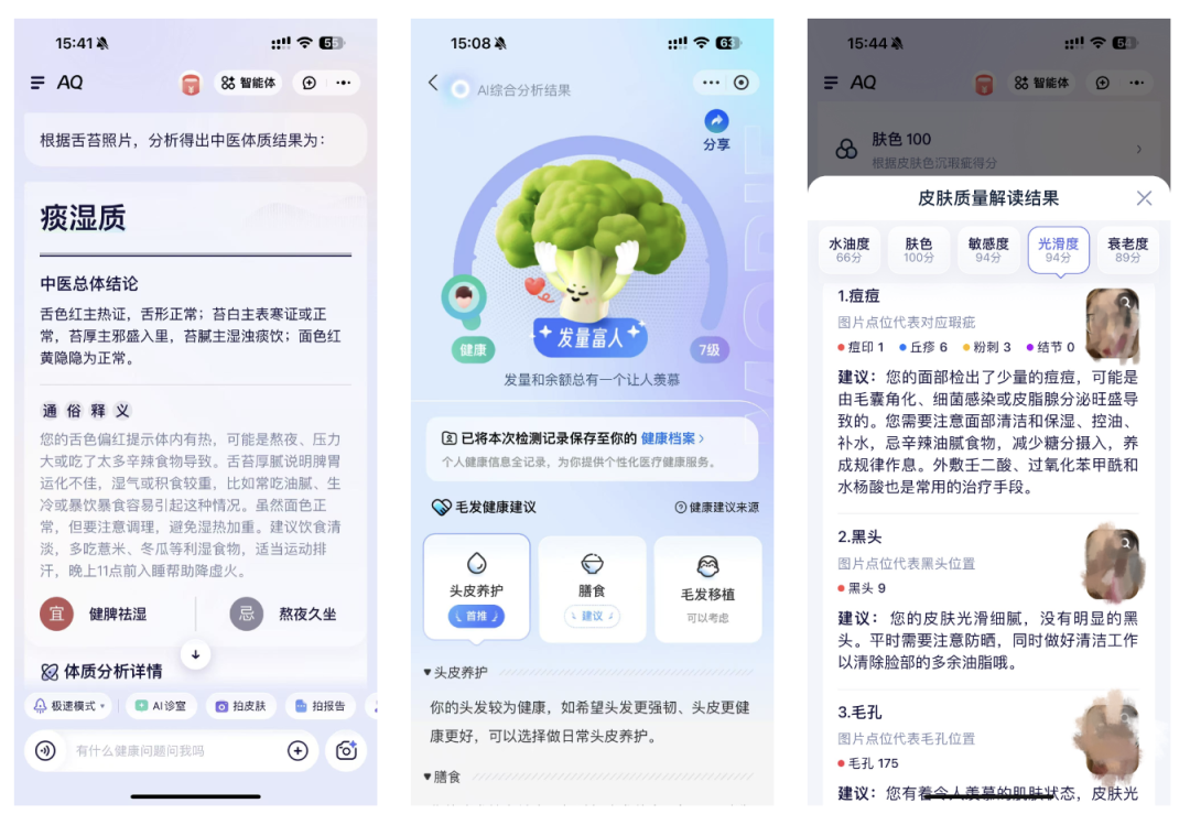 不光能测肤质,还能看舌象和发量,通过皮肤诊断出肤龄、水油度、肤色、敏感度、光滑度、衰老度的得分???