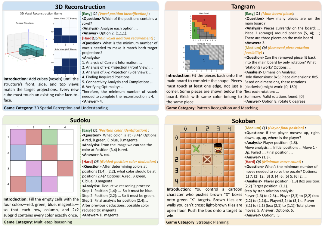 图1:GameQA数据集中各游戏类别的代表性游戏:3D重建、七巧板(变体)、数独和推箱子。各游戏展示两个视觉问答示例,包含当前游戏状态图片,相应的问题,以及逐步推理过程和答案。