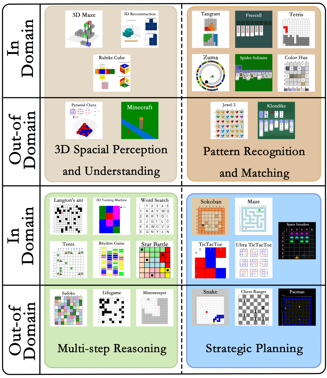 图3:GameQA的30个游戏,分为4个认知能力类别,涵盖3D空间推理、模式识别与匹配、多步推理、策略规划。20个域内游戏用于训练和测试,而10个域外游戏不参与训练,用于测试模型在未见游戏场景下的泛化能力。