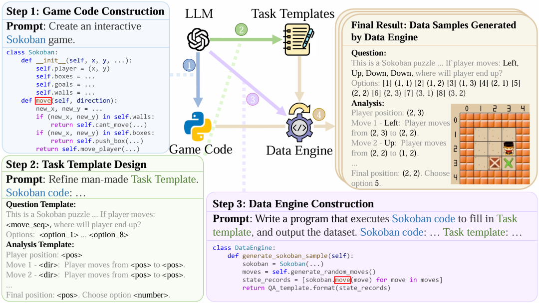 图2:Code2Logic方法,借助LLM通过三个核心步骤将游戏代码转换为推理数据。第一步:游戏代码构建;第二步:游戏任务及其QA模板设计;第三步:数据引擎构建,基于前两步构建自动化程序,然后只要执行代码就能自动批量生成数据。
