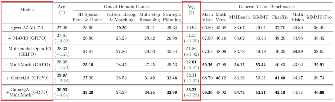 在GameQA上使用GRPO训练,4个开源VLM在7个完全域外的通用视觉语言推理基准上均取得提升(Qwen2.5-VL-7B平均提升2.33%),展现出跨领域泛化,如表1。