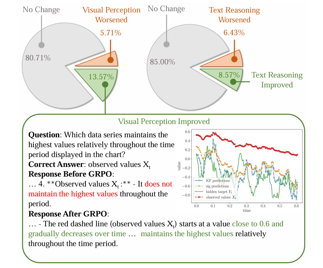 图6:人工定性分析得知模型的视觉感知和文本推理能力均有提升。上方的两个饼图分别是域外通用基准上,视觉感知和文本推理能力的变化情况,下方是视觉感知能力提升的一个案例。