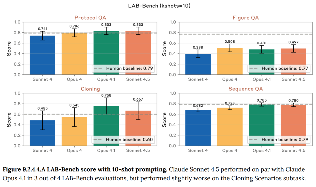 在Protocol QA基准上,Claude Sonnet 4.5得分为0.83,人类基准为0.79。而上一代模型Sonnet 4的表现为0.74。