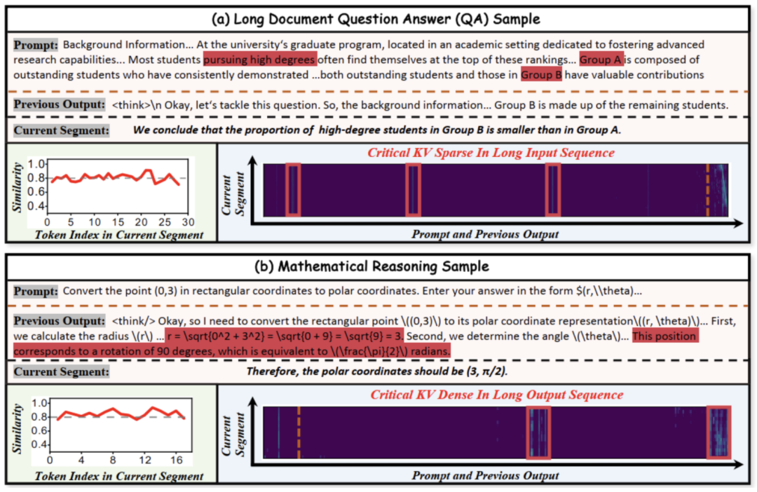 长输入序列中的稀疏分布:在长文档问答(图a)等任务中,生成答案所需的关键信息在长篇输入中呈稀疏、离散的分布状态; 长输出序列中的密集分布:在数学推理(图b)等任务中,模型的注意力会高度集中于先前生成的中间步骤,使得关键 KV 在局部区域内呈现密集分布。