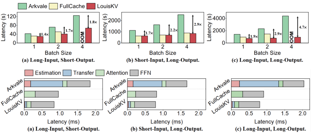 大幅降低延迟:与先进的KV检索方法Arkvale相比,LouisKV实现了高达1.4倍至4.7倍的端到端推理加速; 支持更大批量:当处理大批量任务时,FullCache会因显存不足而失效。相比之下,LouisKV能够在此类高负载场景下稳定运行,从而显著提升了系统的有效吞吐量。
