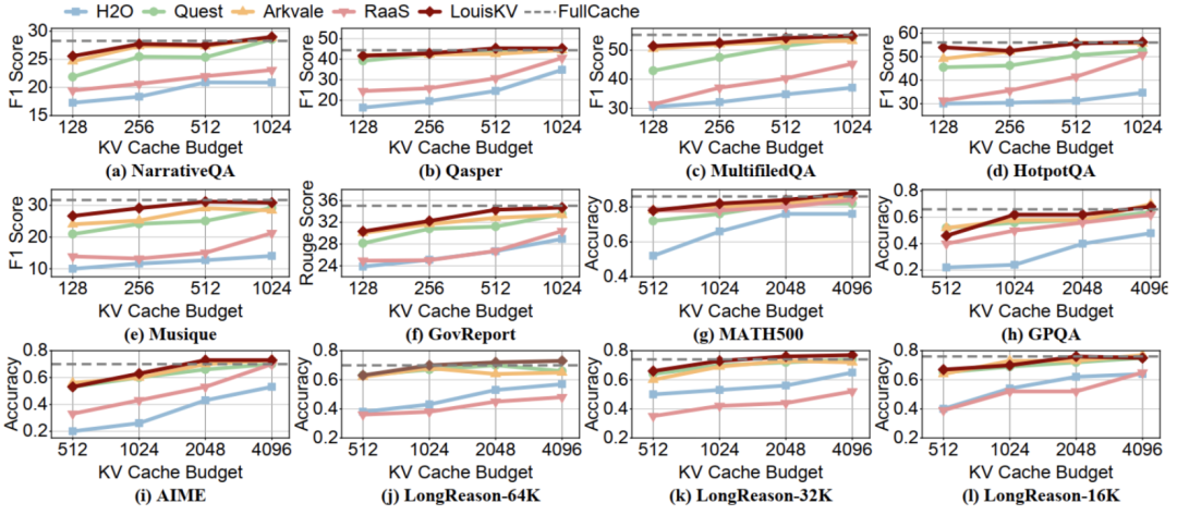 推理精度层面,在所有12个基准测试中,LouisKV的性能表现都极其接近将全部KV cache保留在GPU中的FullCache方案(灰色虚线),后者代表了理论上的精度上限。
