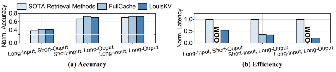 通过这种细粒度的管理,LouisKV创建的检索单元(语义簇/时序段)与模型的实际注意力模式高度匹配,避免了传统页式管理中大量无关KV的冗余传输,显著提升了检索精度。