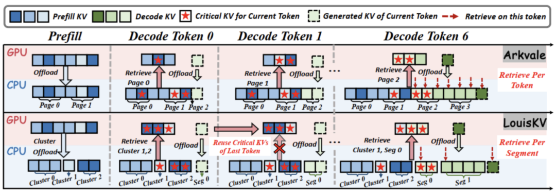 现有方法通常在生成每个 token 时都触发一次检索操作,这引入了重要性评估的计算开销与 CPU-GPU 间的数据传输开销。在需要生成数千甚至数万 token 的长输出任务中,检索操作带来的累积开销尤为突出,导致模型推理效率不高; 现有方法普遍采用固定大小的页(page)作为检索的基本单元。这种粗粒度的划分方式,常常导致被检索的页中仅包含少量真正关键的 KV 条目,而大量无关条目占用了宝贵的 CPU-GPU 带宽和 GPU 上的缓存预算。这不仅造成了数据传输的浪费,更重要的是,在有限的预算下,它挤占了本可以留给其他更关键信息的位置,导致模型推理精度的下降。