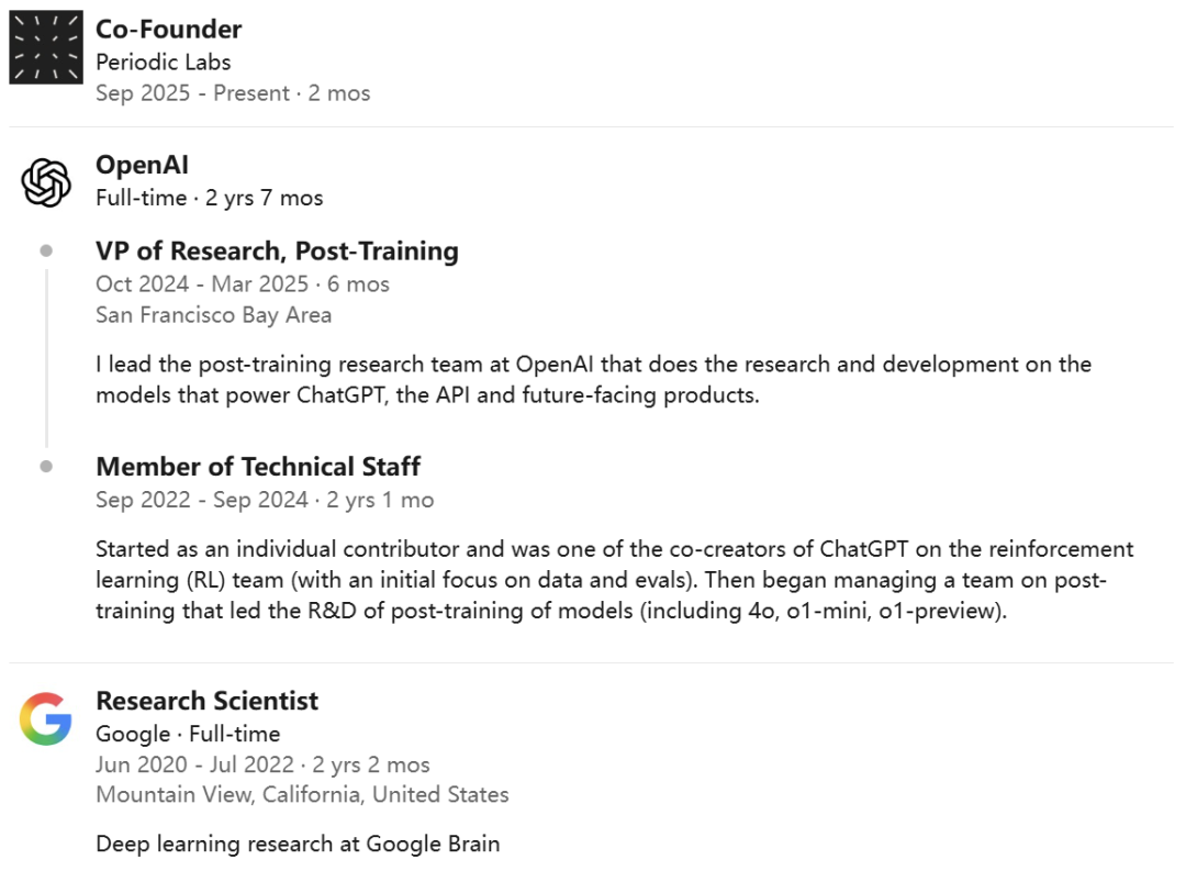 这两位联合创始人一位是William Liam Fedus,OpenAI前研究副总裁,核心团队成员之一,参与创造了划时代的ChatGPT;
