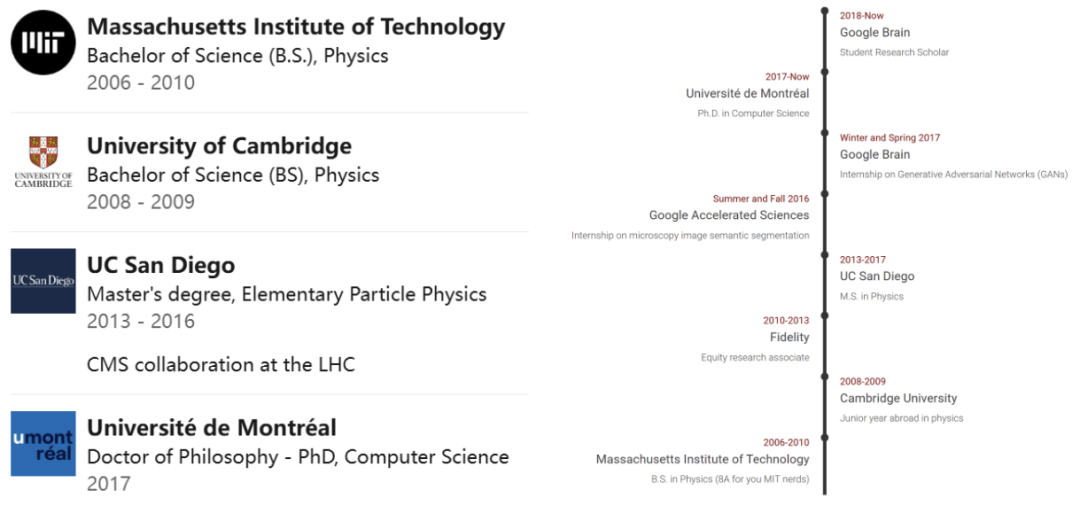 2016年,他获得了加州大学圣迭戈分校基本粒子物理学的硕士学位,导师是David Meyer和Gary Cottrell。