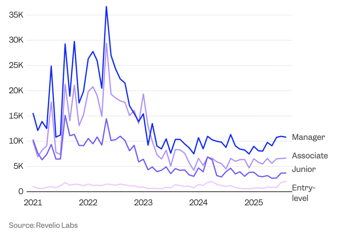 相对而言,那些以经验与洞察为核心的岗位展现出更强的韧性,资深员工的就业率保持稳定甚至小幅增长。