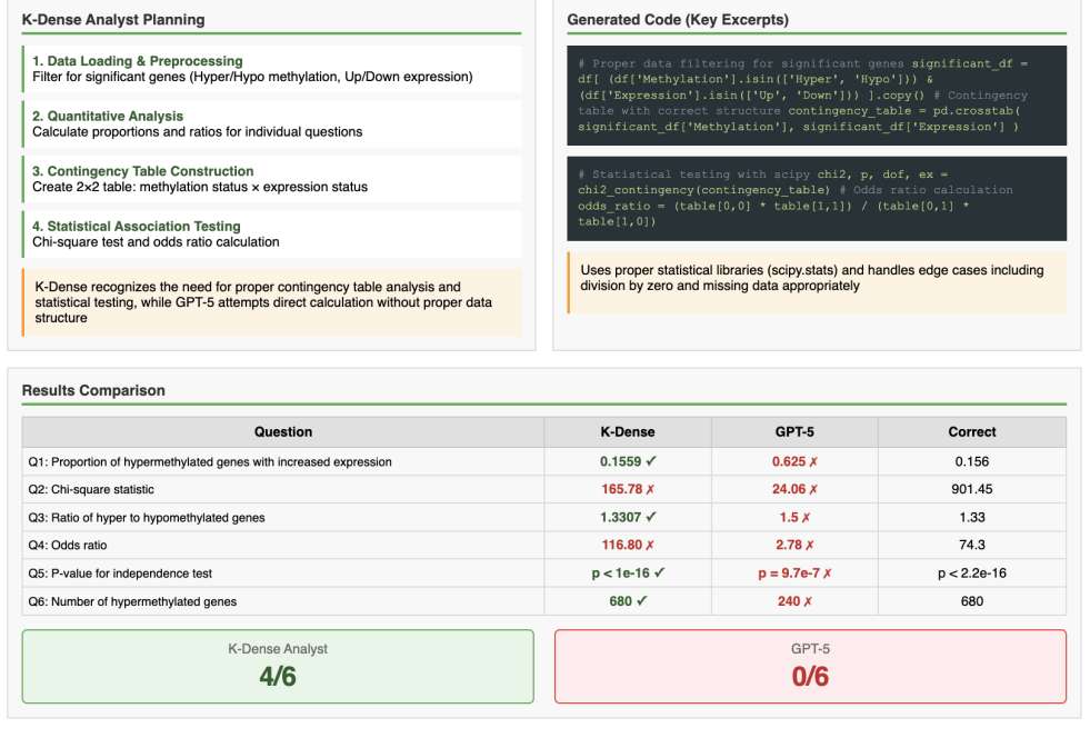 举个例子:在RNA甲基化数据分析任务里,K-Dense Analyst能分步骤完成数据过滤、定量分析、列联表构建和卡方检验,而GPT-5连基本结构都没搭好。