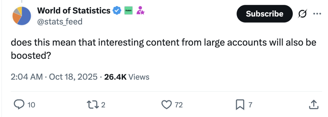 对于大号或已经被算法认可的账号,规则很容易就能判定内容“优质”,所以他们的帖子通常曝光很高。