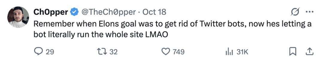 有意思的是,马斯克当初收购X时的目标,是清理掉机器账号,让平台回归“真实对话”。而现在,他却让Grok接管整个平台的信息流。