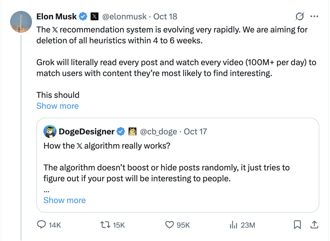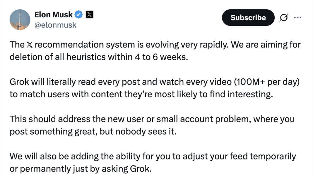 马斯克宣布:X(推特)将在未来几周内彻底移除启发式推荐算法,由Grok接手,通过阅读和观看全部内容来全自动匹配用户兴趣。
