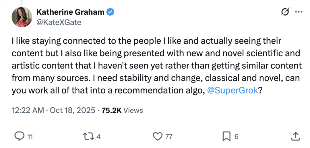 而且,用户还可以对Grok提出请求,从而动态调整内容推荐,让其更个性化。