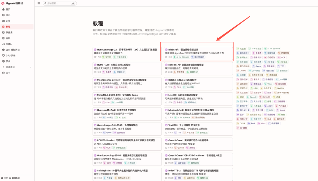 1. 进入 hyper.ai 首页后,选择「教程」页面,并选择「BindCraft:蛋白质粘合剂设计」,点击「在线运行此教程」。