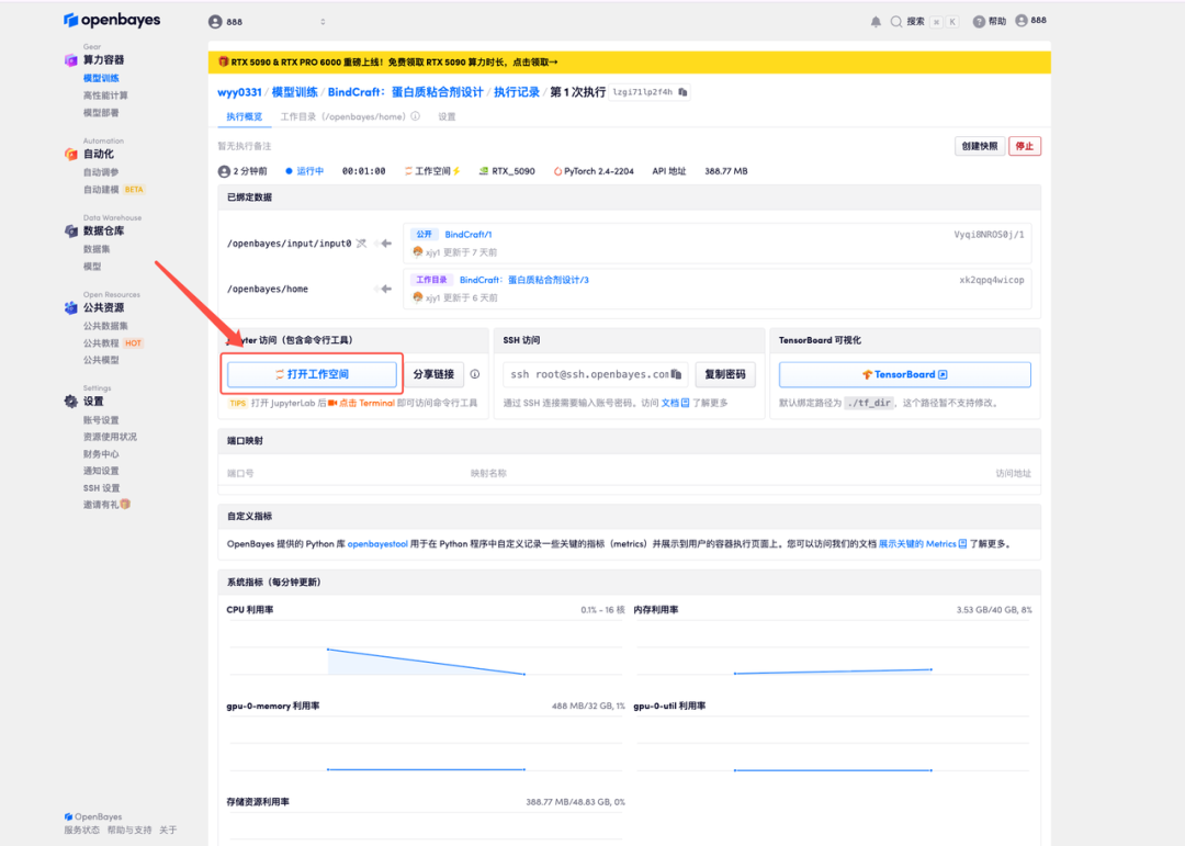 4.等待分配资源,首次克隆需等待约 2 分钟左右的时间。当状态变为「运行中」后,点击「打开工作空间」,即可跳转至 Demo 页面。