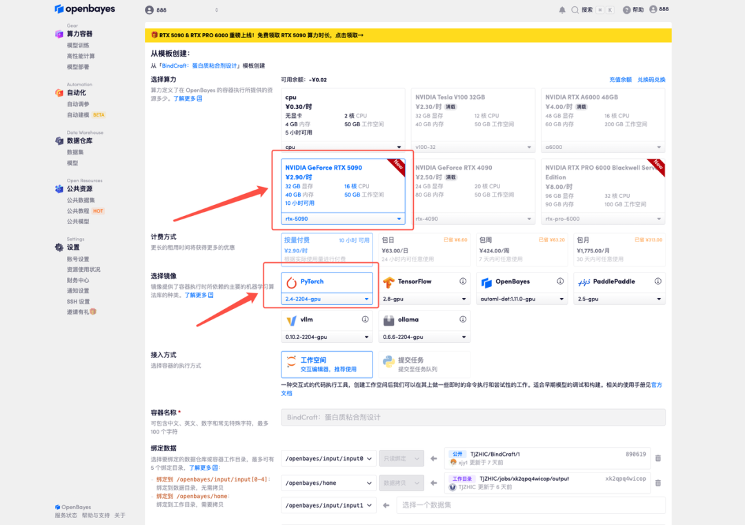 3. 选择「NVIDIA GeForce RTX 5090」以及「PyTorch」镜像,并点击「继续执行」。OpenBayes 平台提供了 4 种计费方式,大家可以按照需求选择「按量付费」或「包日/周/月」。新用户使用下方邀请链接注册,可获得 4 小时 RTX 5090 + 5 小时 CPU 的免费时长!