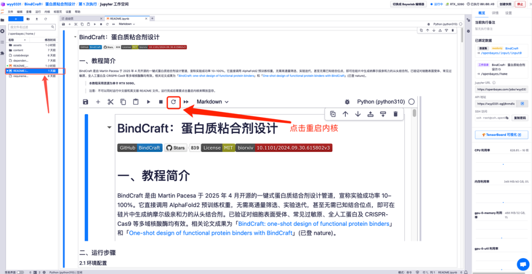 5.以下为 BindCraft 使用页面,点击「README」即可跳转至生成界面。