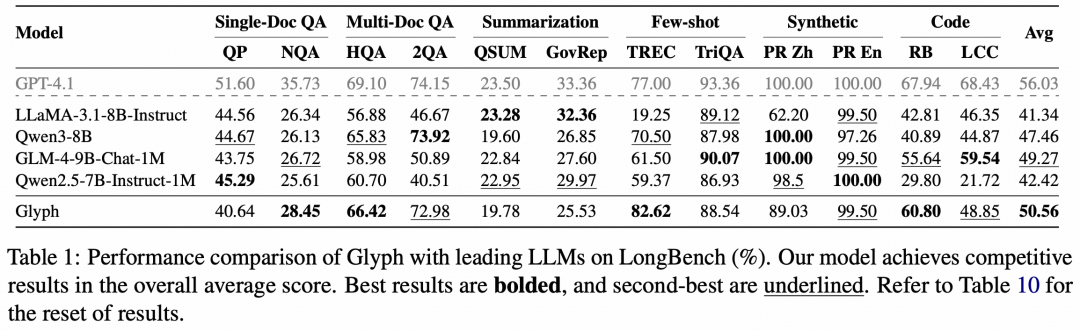 表|Glyph 与主流 LLM 在 LongBench 上的性能对比(%)。