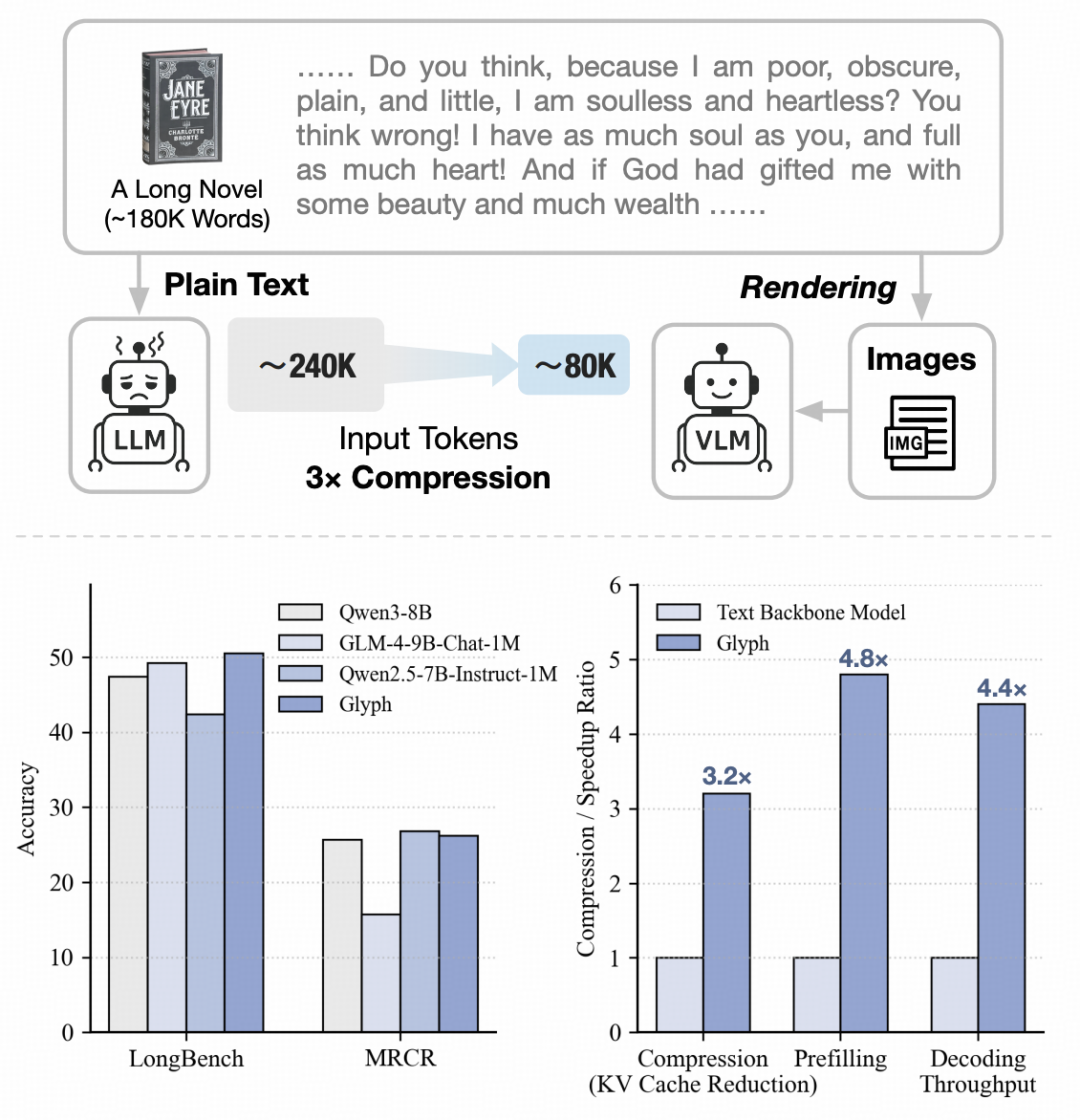 相比之下,Glyph 将全书内容呈现为紧凑的图像(约 80k 视觉 token),使 128k 上下文的 VLM 能够回答上述问题。