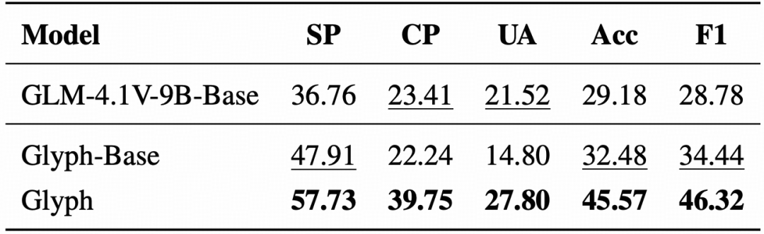 4.在 MMLongBench-Doc 上,Glyph 在文档理解任务上显著优于原始视觉语言基线,展现了跨模态泛化能力。
