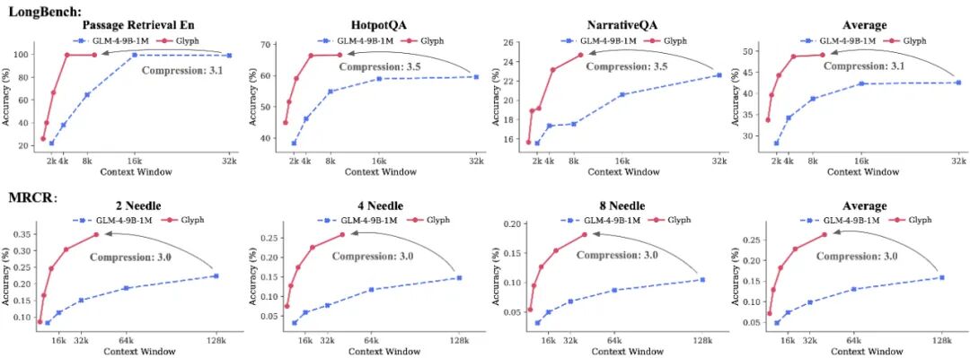 实验结果表明,通过持续预训练、由 LLM 驱动的遗传式渲染搜索,以及有针对性的后训练优化,Glyph 在保持与前沿 LLM 相当精度的同时,实现了 3-4 倍的 token 压缩,大幅提高了内存效率、训练和推理速度。