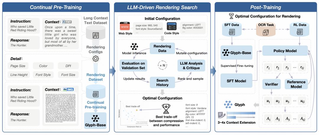 为应对这一挑战,来自清华大学和智谱(Z.ai)的研究团队摒弃了基于 token 的序列扩展范式,转而基于「视觉上下文扩展」全新视角提出了 Glyph 框架,即将长文本渲染成图像,并通过视觉语言模型(VLM)进行处理。