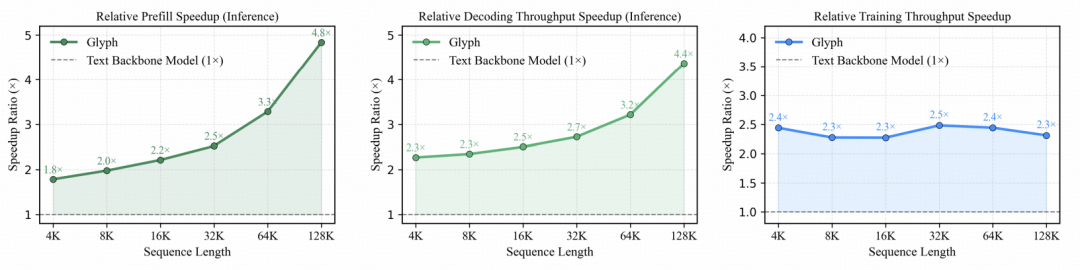 图|在预填充、解码和训练过程中,Glyph 相对于文本骨干模型在不同序列长度下的加速比。