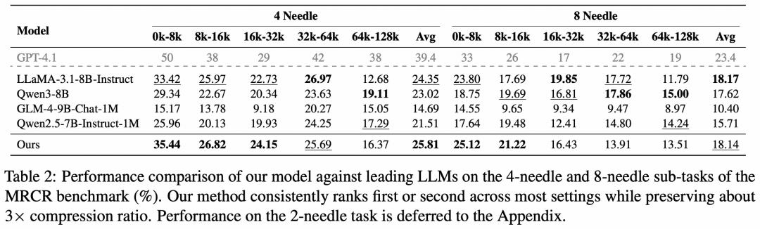 表|模型在 MRCR 基准测试 4-needle 与 8-needle 子任务上的性能对比(%),在多数设置下位于前两名,同时保持约 3 倍压缩率。