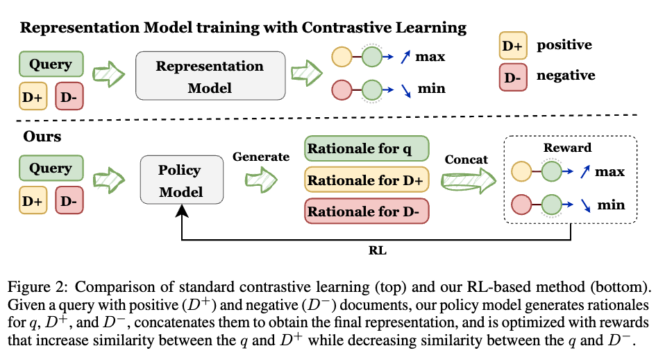 模型首先生成每个文本的“推理说明(rationale)”,然后再将这些rationale编码成Embedding。奖励信号会鼓励模型产生更有逻辑、更语义一致的推理。