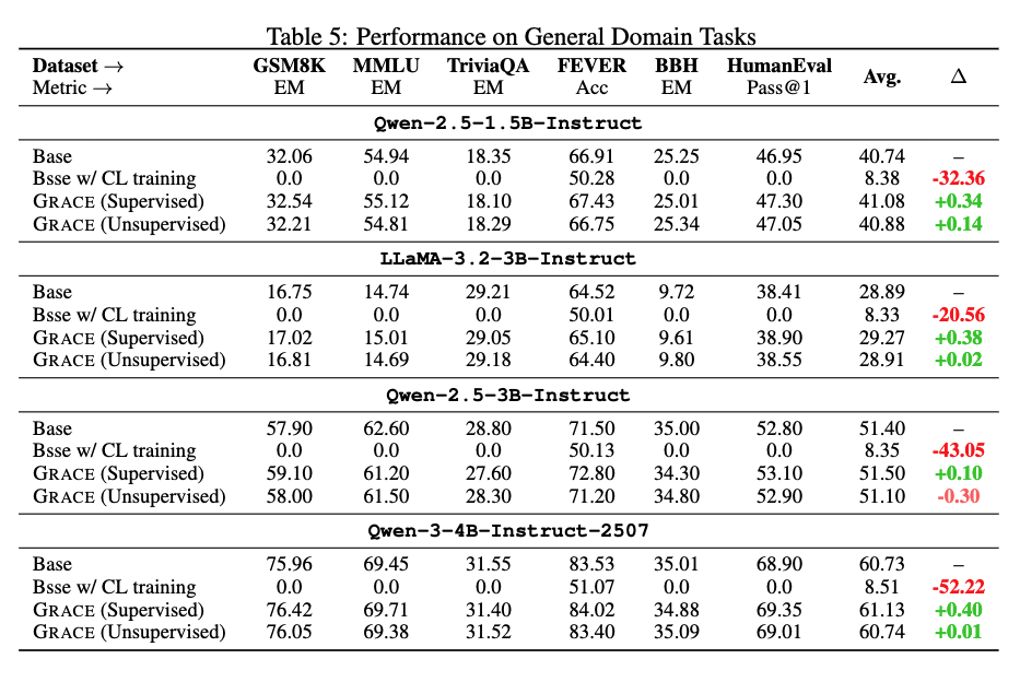 研究人员验证了GRACE在通用任务(GSM8K、MMLU、FEVER、BBH、HumanEval)上的影响,结果显示性能几乎无下降,Δ<0.5%,远好于InfoNCE基线的“灾难性遗忘”。