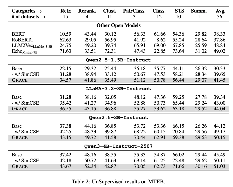 GRACE既可以用带标签的query–document对训练(supervised),也可以无监督地自对齐(unsupervised)。